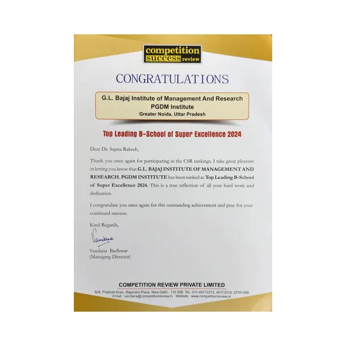 GL Bajaj Institute of Management and Research (GLBIMR) is a premier management institute known for its commitment to excellence in education and holistic development. Located in Greater Noida, the institute offers industry-oriented MBA programs, designed to equip students with the skills needed for a successful career in the corporate world.